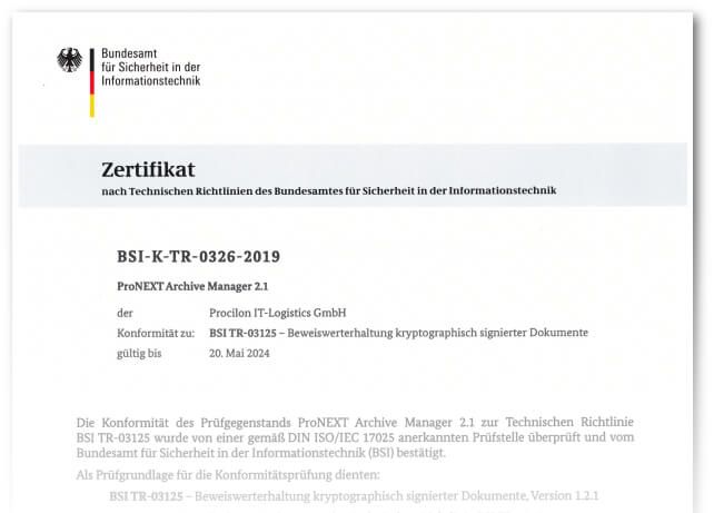 Um die juristische Beweiskraft elektronisch signierter Dokumente langfristig sicherzustellen, sind geeignete Maßnahmen im Rahmen der Langzeitarchivierung erforderlich. Genau hier setzt BSI-zertifizierte Fachsoftware wie der proNEXT-Archive-Manager an – sie sorgt dafür, dass signierte Daten auch über viele Jahre hinweg zuverlässig validiert und archiviert werden können.