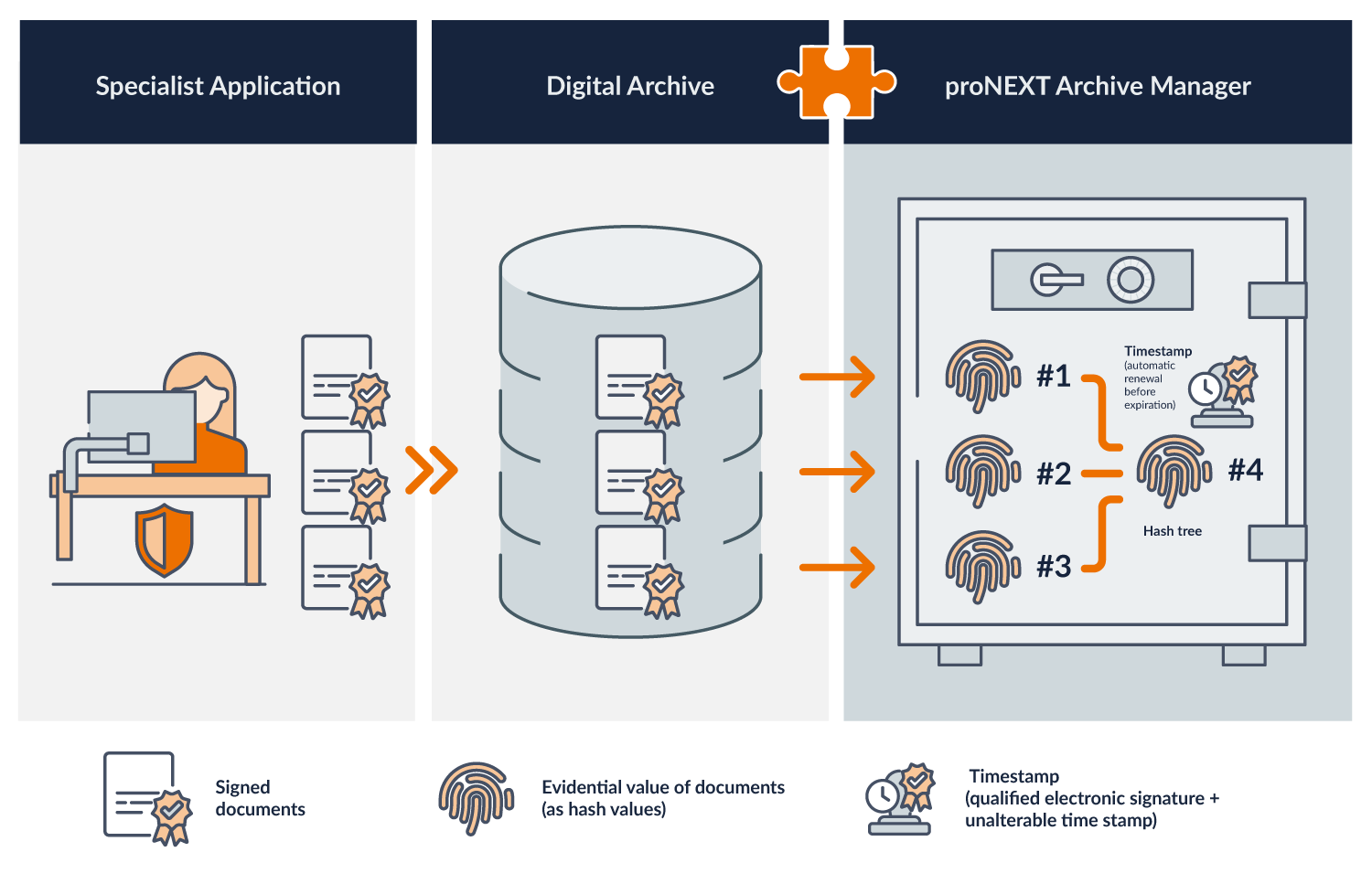 The eIDAS- and TR-ESOR-compliant addition to your digital archive system: the proNEXT Archive Manager ensures the long-term preservation of the evidential value of your electronic documents (according to Section 371a of the German Code of Civil Procedure). As specialized GoBD-compliant archiving software (middleware), it handles evidential preservation fully automatically – without manual intervention or system changes. This ensures that your documents remain legally secure for decades.