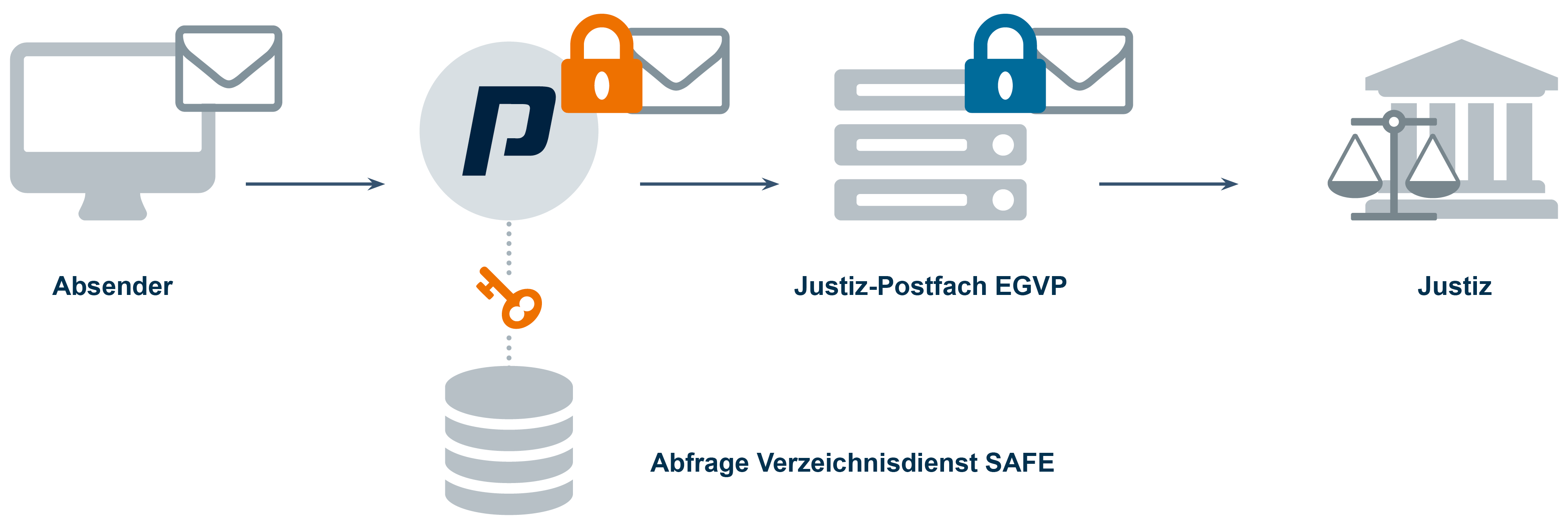 Zum Versand einer beBPo Nachricht müssen die Informationen zunächst mit dem öffentlichen Schlüssel des Gerichts verschlüsselt und anschließend an einen Intermediär verschickt werden. Der Intermediär leitet den ungeöffneten Umschlag der beBPo Nachricht an das Gericht weiter, welches die beBPo Nachricht schließlich mit dem eigenen privaten Schlüssel öffnet.
