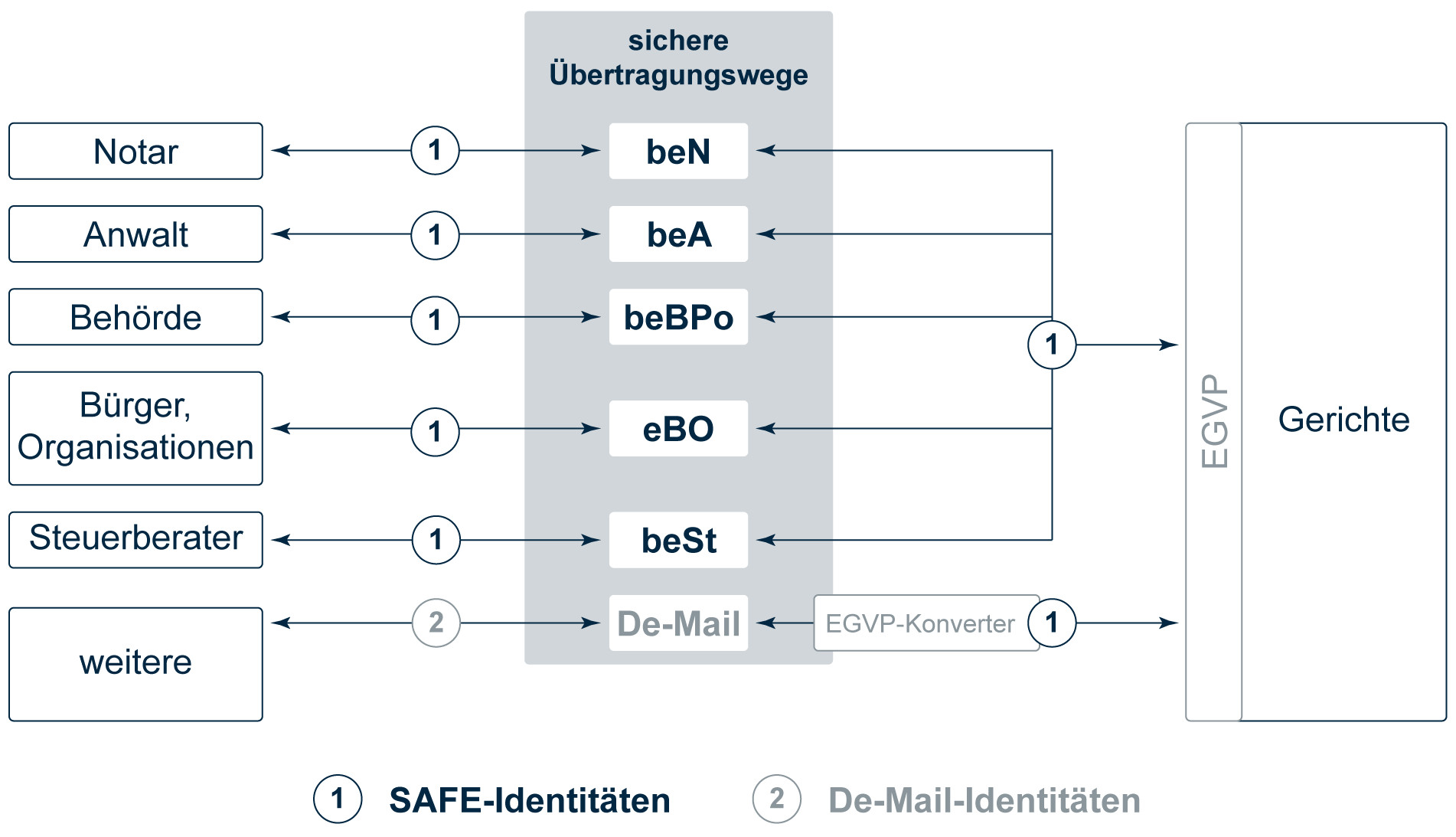 Die zu Grunde liegende Infrastruktur wird für Nutzer, wie z.B. Firmen und Behörden, von der Justiz zur Verfügung gestellt. Voraussetzung für die Nutzung dieser Infrastruktur ist eine ERV-konforme Sende- und Empfangssoftware, z.B. proGOV. Ein weiteres zentrales Element für den Elektronischen Rechtsverkehr ist eine elektronische Identität (SAFE-ID) durch die Registrierung und Eintragung im sicheren Verzeichnisdienst nach dem SAFE-Standard. Hier werden Vertrauensstellungen unterschiedlicher Gruppen wie Gerichte, Rechtsanwälte, Notare oder auch Behörden definiert.