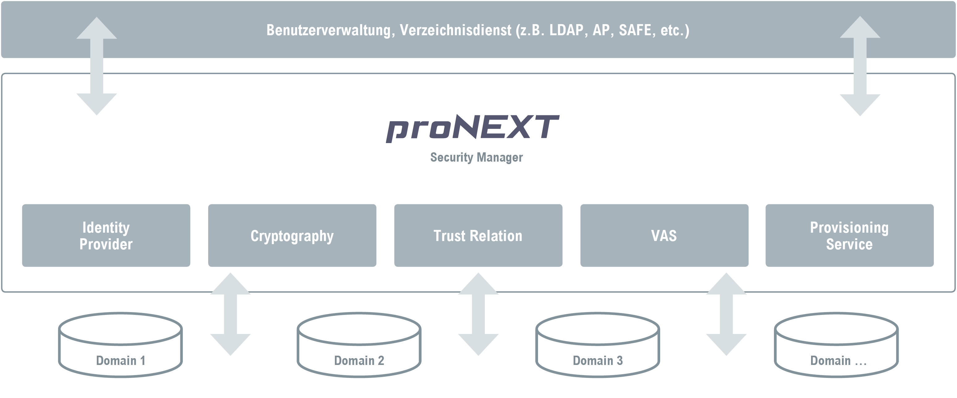 proNEXT Security Manager ermöglicht verschiedene sichere Authentifizierungsvarianten sowie eine zentrale Identitätsverwaltung. Dank einer starken digitalen Identität (ID) können Sie Ihre elektronische Kommunikation mit einem speziell an Sie gebundenen Zertifikat digital signieren und verschlüsseln.
